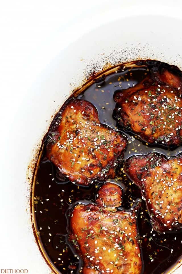 Recipe at : Crockpot Honey Garlic Chicken Thighs