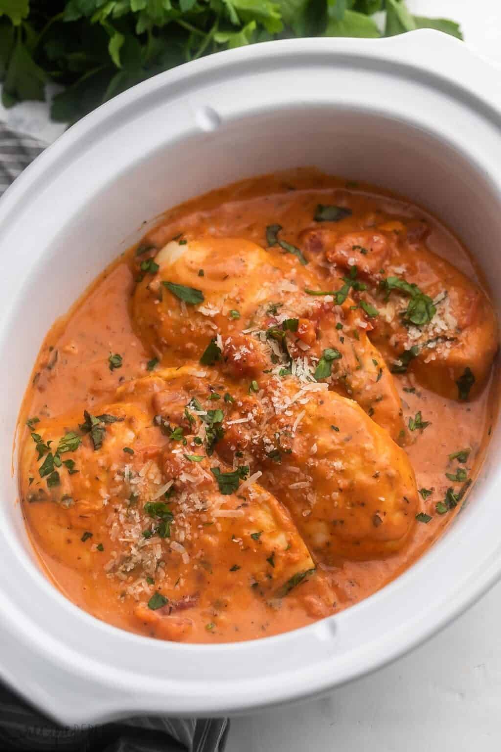 Slow Cooker Creamy Tomato Basil Chicken from The Recipe Rebel (recipe by Ashley Fehr) is a rich and comforting crockpot dinner where juicy chicken breasts cook low and slow in a creamy tomato-basil sauce with Italian herbs and savory flavors — ideal served over pasta, rice, or mashed potatoes for an easy, satisfying meal.