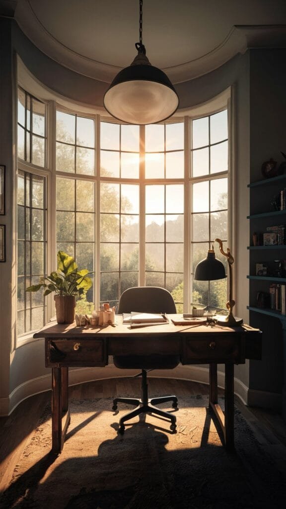 A home office with large windows that let in plenty of sunlight makes working from home a pleasure. The bright light boosts productivity and mood.