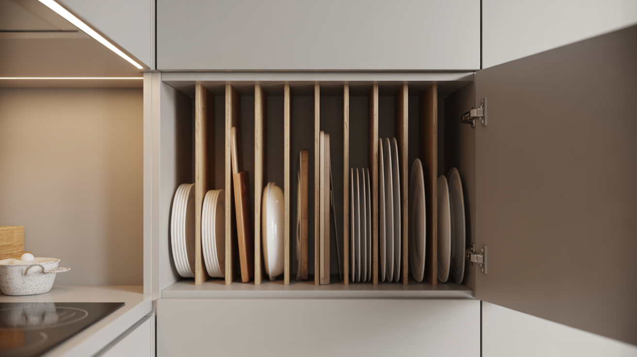 For plates and trays, storing items upright using adjustable vertical cabinet dividers keeps everything visible and easy to grab.
