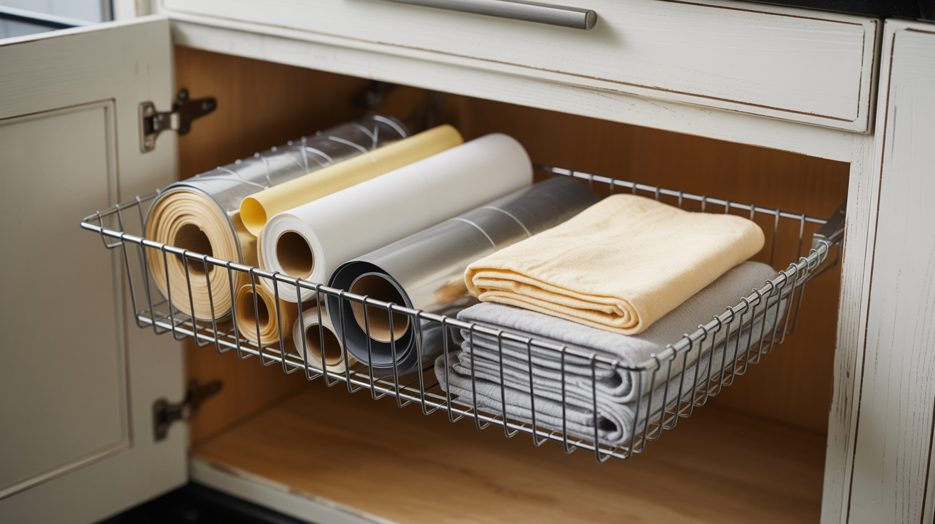 That’s why many people add under-shelf cabinet baskets to separate wraps, towels, or frequently touched items.